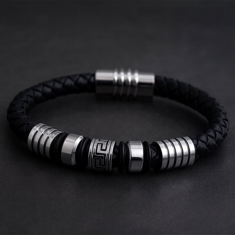 A Forclet Görög Mintás nemesacél és fonott bőr karkötő kialakításában a kiváló minőségű nemesacél elemek, a jól ismert fonott bőr kialakítás, valamint a könnyen kezelhető elegáns mágnes csat kiválóan harmonizálnak.